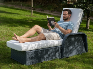 ✅ Precyzyjna, 4-stopniowa regulacja oparcia, pozwalająca na błyskawiczną zmianę pozycji – od całkowicie płaskiego łóżka do opalania, po wygodny fotel do czytania z oparciem o wysokości do 100 cm