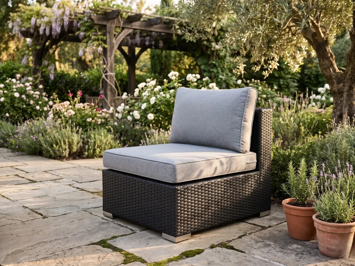 Moduł środkowy może pełnić funkcję samodzielnego fotela na kameralnym balkonie lub być kluczowym elementem rozbudowanego narożnika w ogrodzie.