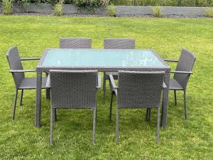 Szklany, matowy blat stołu jest wbudowany w technorattanową ramę.
